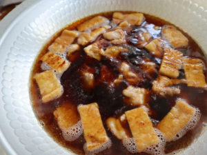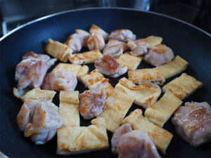 2.鶏モモ肉と油揚げを胡麻油ひいたフライパンで焼き目がつくまで焼